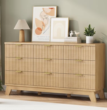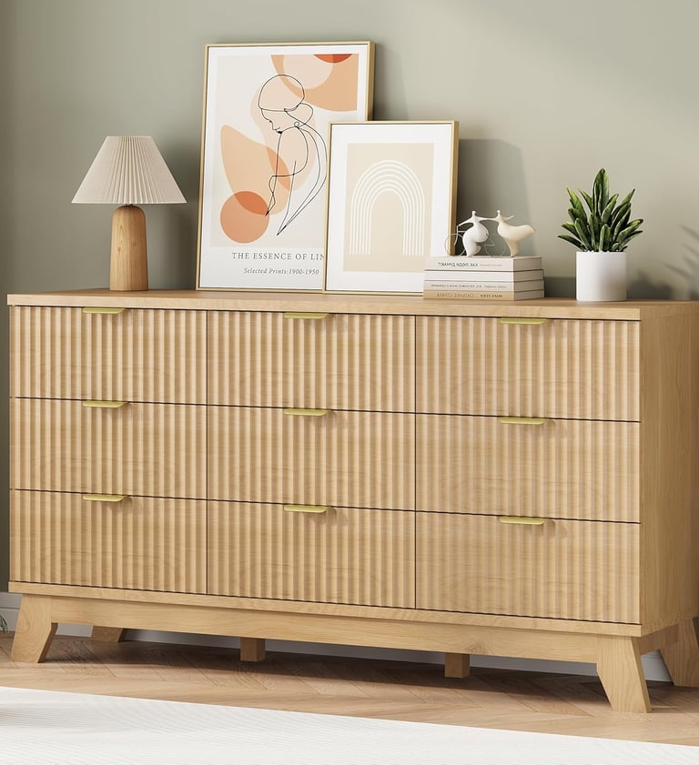 【Modern Chic Appearance】The unique wave-like fluted panel enhances the texture and elegance of this bedroom dresser. The thick table top features natural wood grain that complements the natural oak finish. The wide metal handle and splayed base legs add a modern touch, creating a personalized and distinctive appearance